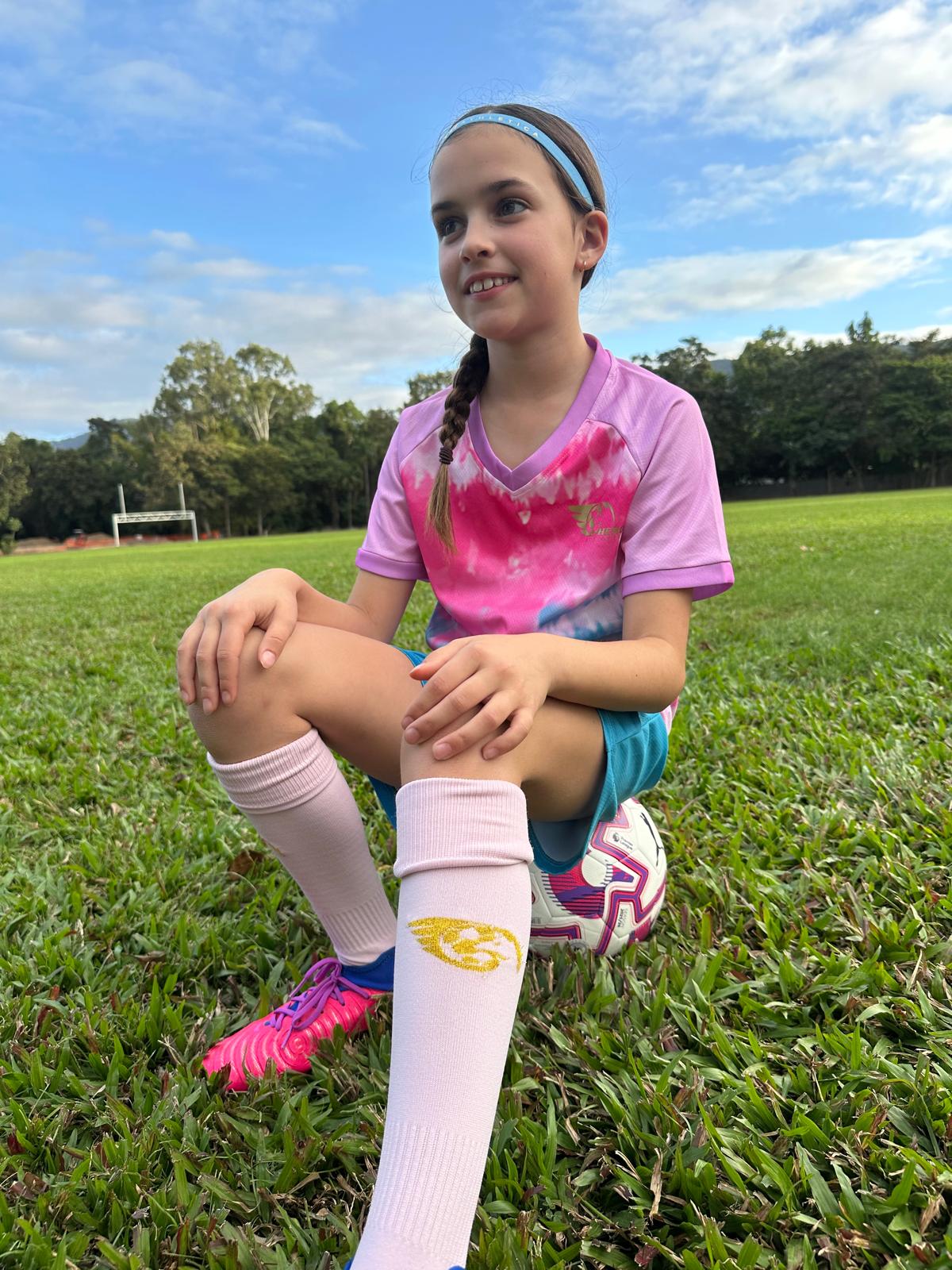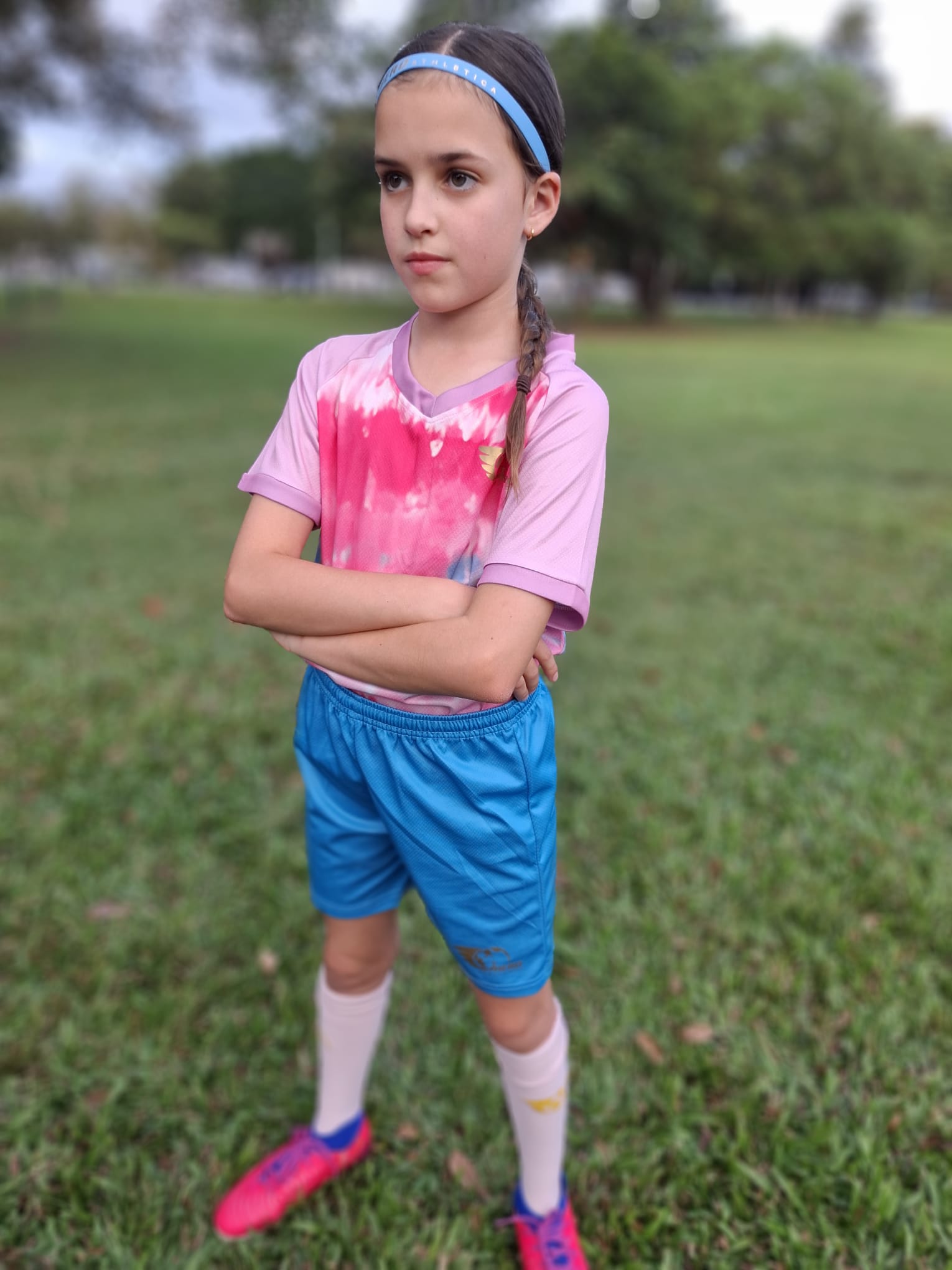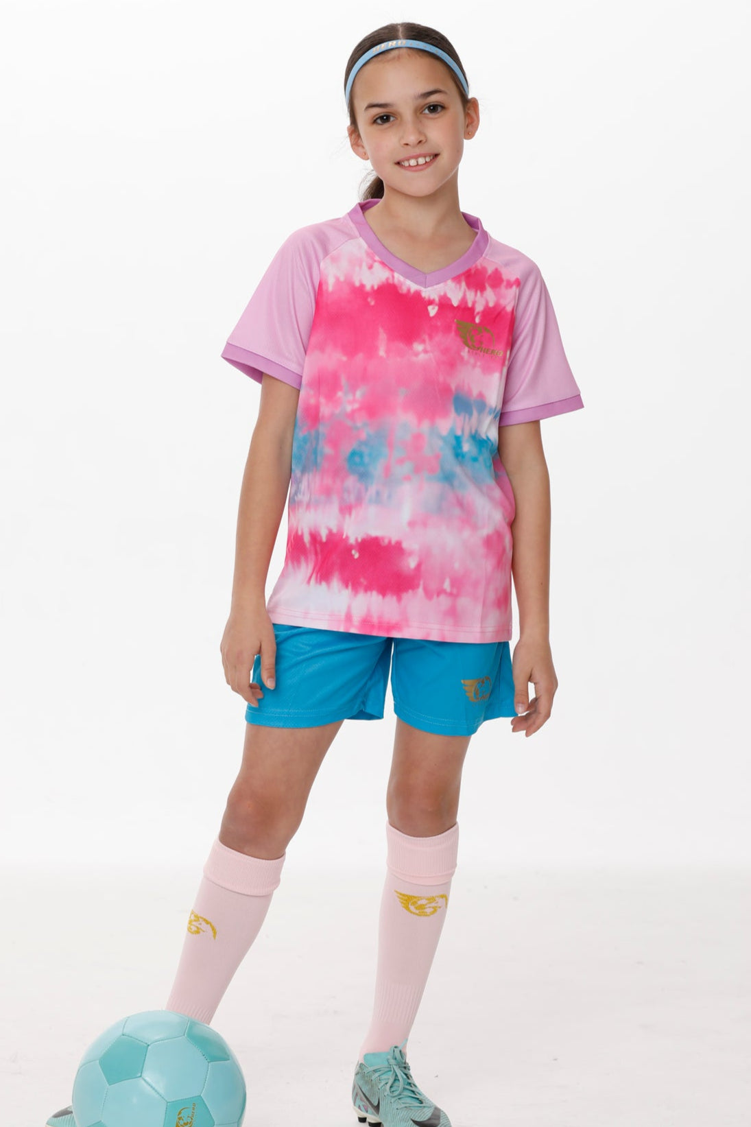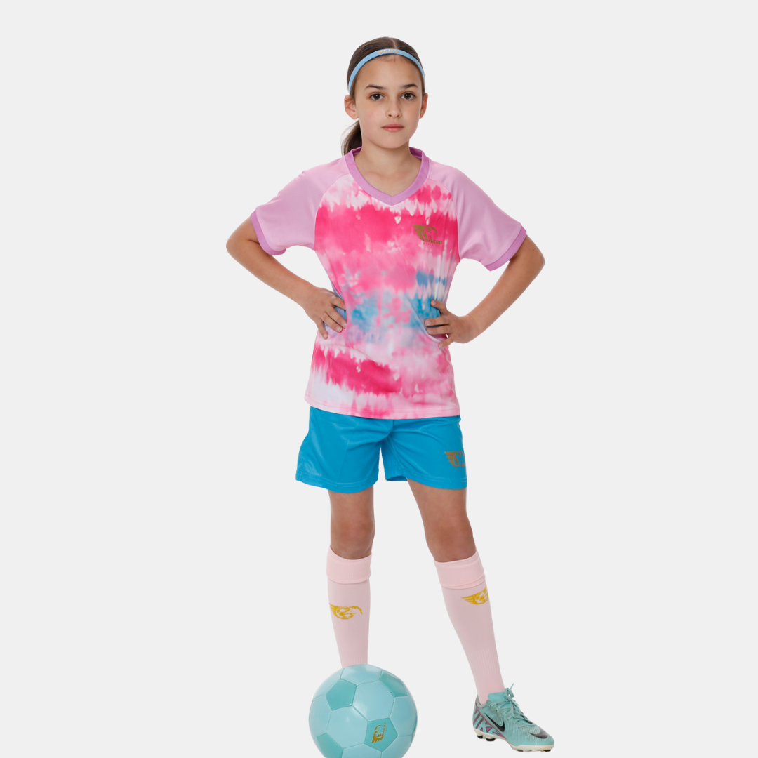 Inspired by the glowing colours of dawn and the Northern Lights, the Aurora Football Kit brings pink hues to life, with a middle burst of turquoise blue which continues into the shorts. It’s energy you can wear, made for girls who light up every pitch, park, and dance floor.