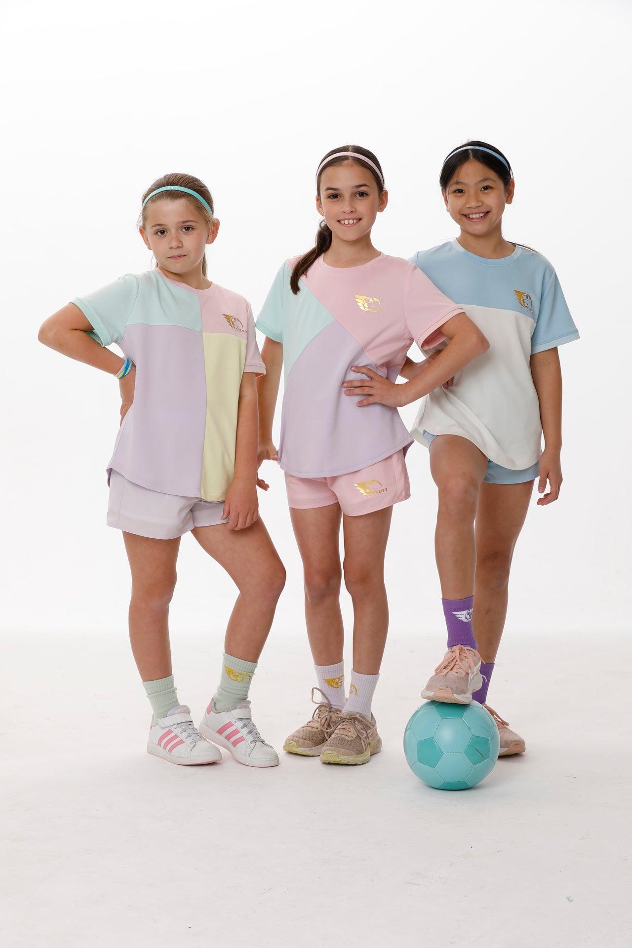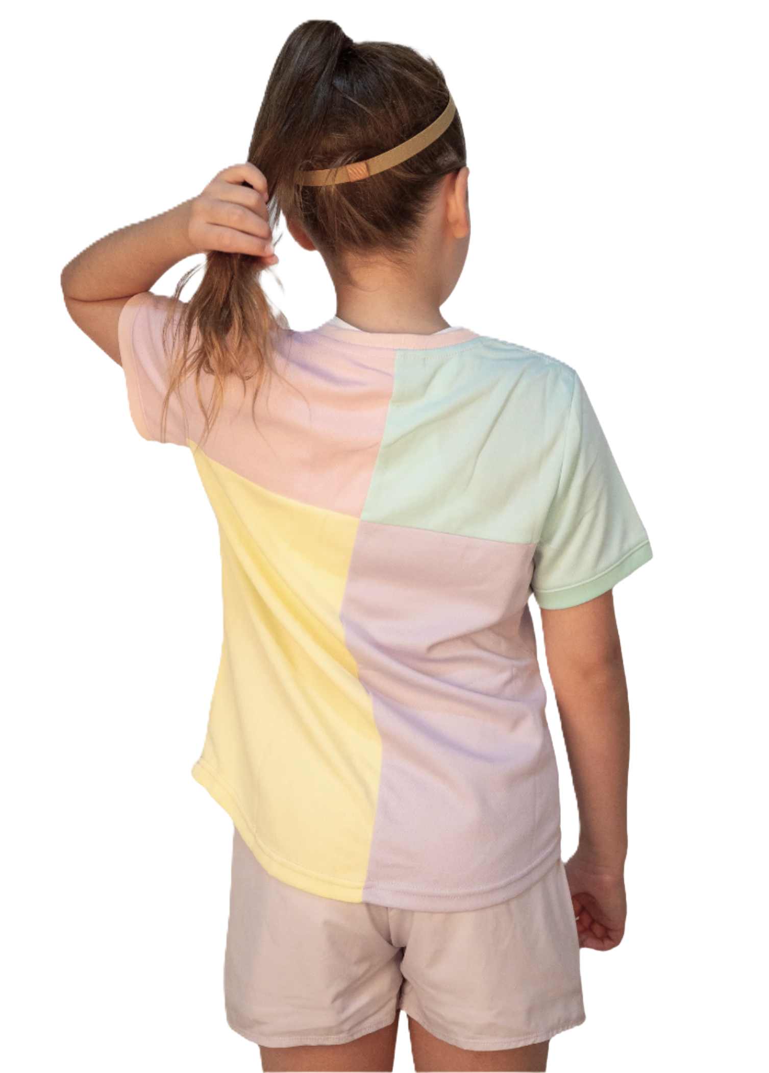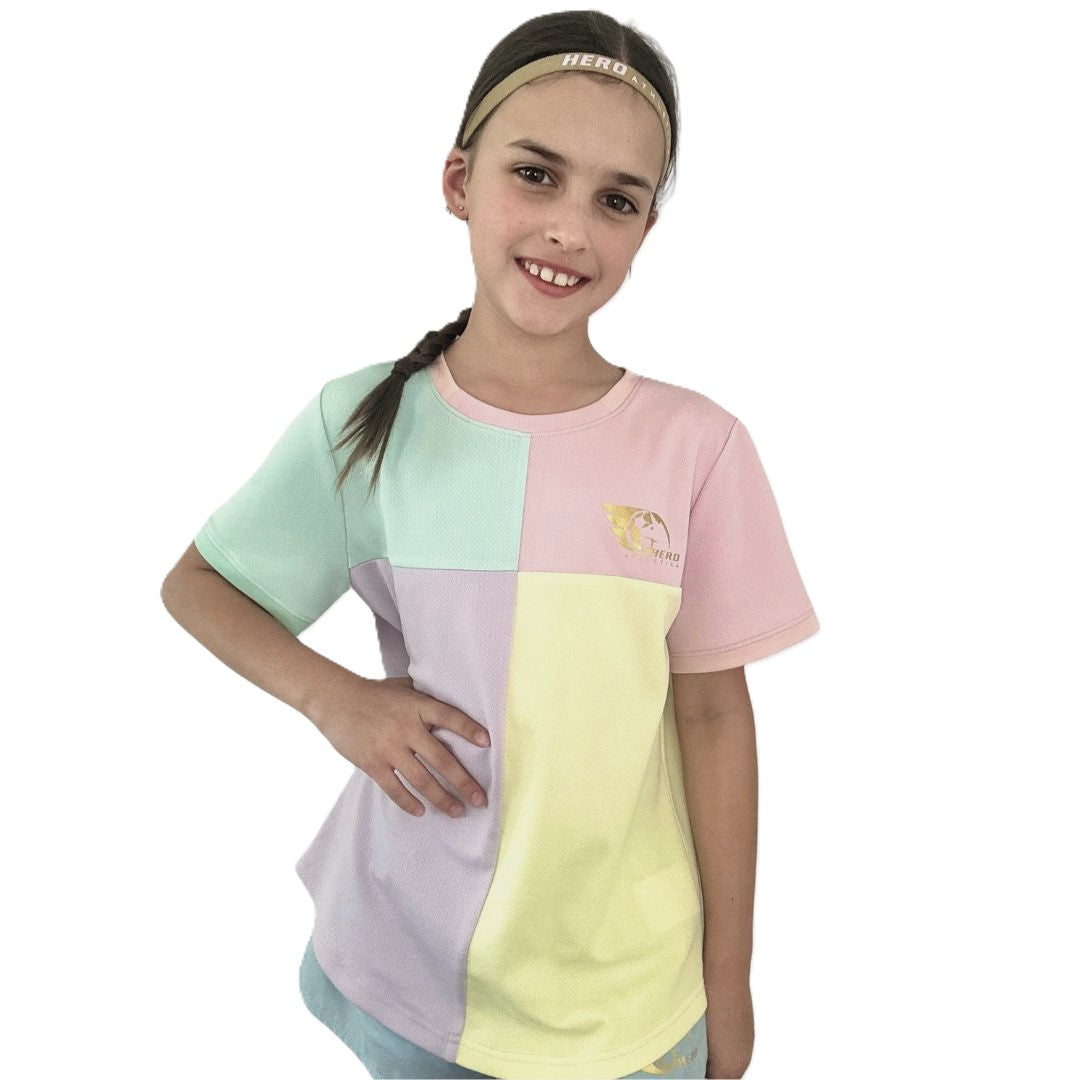 Meet Hero Athletica's very first design, the Betty Sports Shirt! This ultimate sports top is as lively as you are. Featuring our most colorful design yet, this sports shirt combines a vibrant quad block pattern with pastel green, pink, yellow, and purple. Whether on the field or beyond, the Betty Sports Shirt blends style, fun, and comfort for girls ready to conquer their day.
