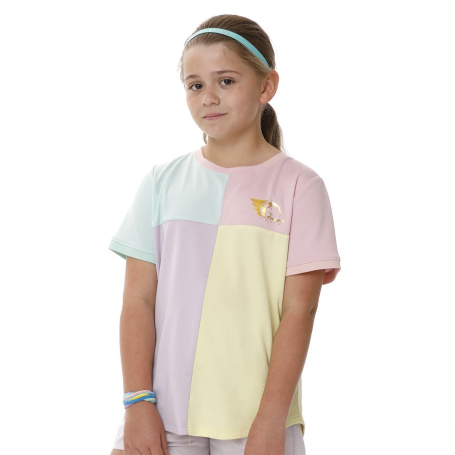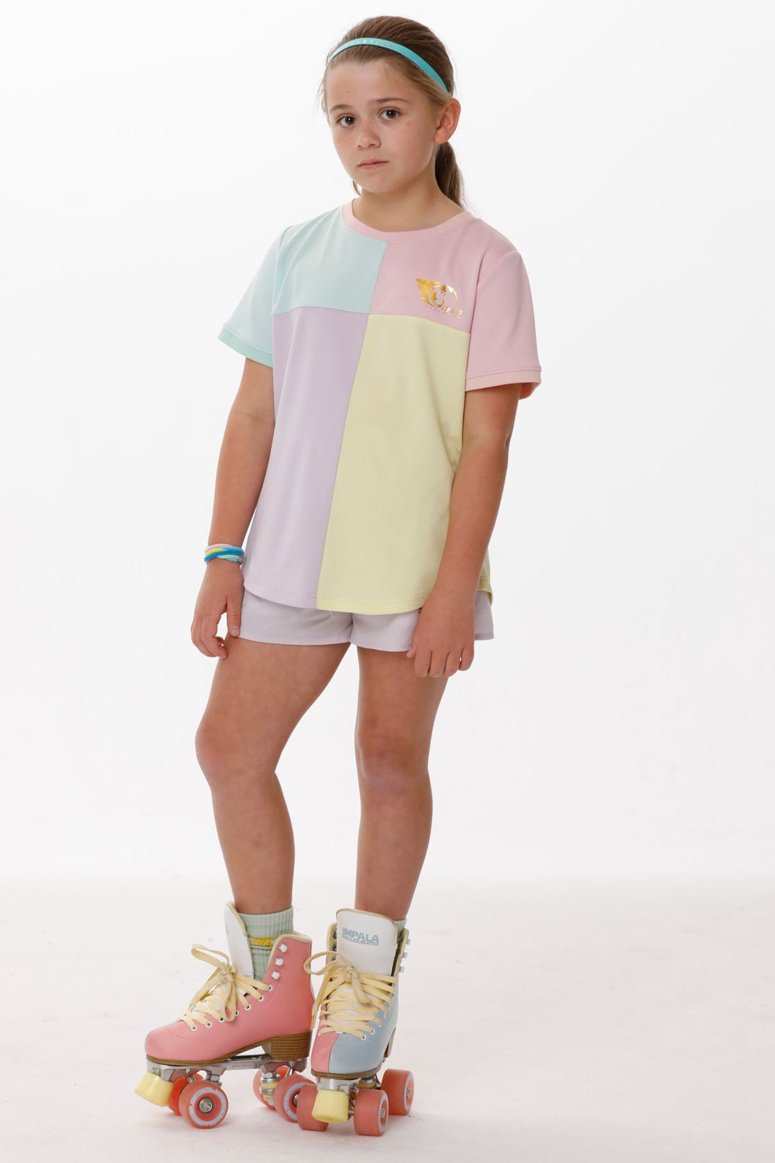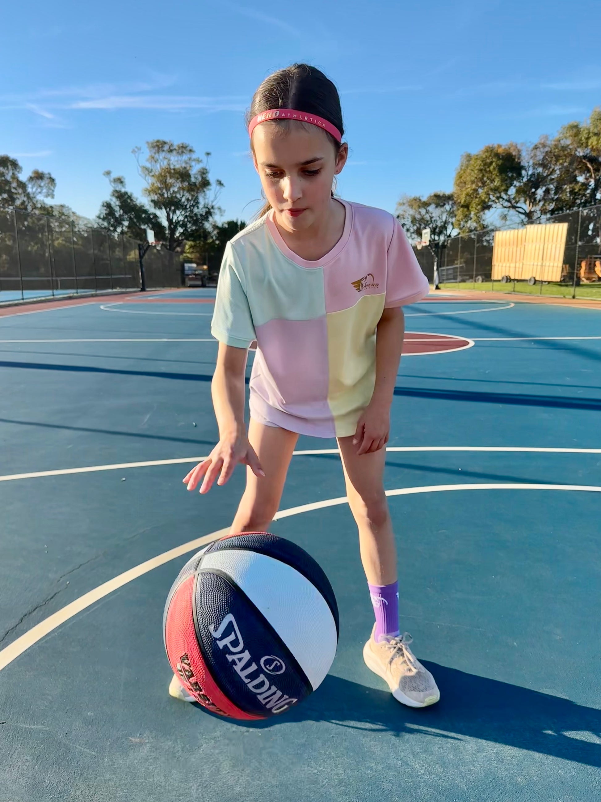 Meet Hero Athletica's very first design, the Betty Sports Shirt! This ultimate sports top is as lively as you are. Featuring our most colorful design yet, this sports shirt combines a vibrant quad block pattern with pastel green, pink, yellow, and purple. Whether on the field or beyond, the Betty Sports Shirt blends style, fun, and comfort for girls ready to conquer their day.