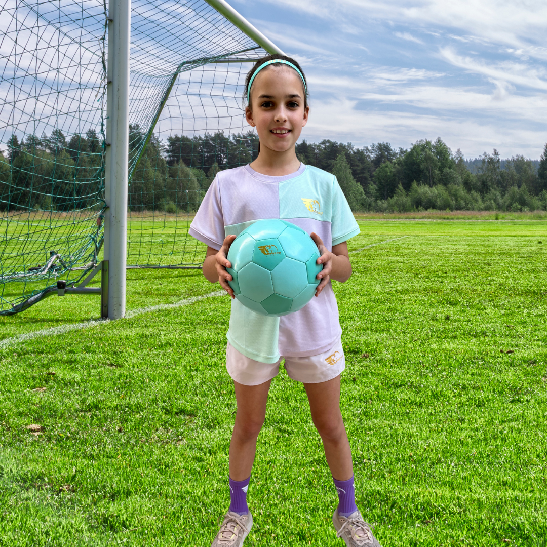 Experience the fun of this standout monochrome teal football with gold logo crafted with a durable PU machine stitched cover. This lightweight football is ideal for girls wanting to work on their skills or just have a kick with their friends.